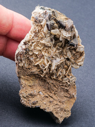 This is a lovely and highly aesthetic piece of quartz and barite on matrix.This is a lovely and highly aesthetic piece of quartz and barite on matrix. Most crystals are in perfect condition, clear and nicely arranged. The tabular, yellow barite crystals are pretty all around. Sphalerite matrix provides a nice contrast for this charming piece. The largest quartz crystal has a visible water bubble (size cca 1.5 mm).