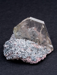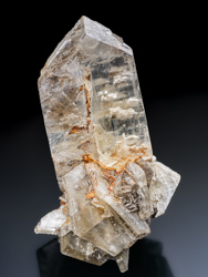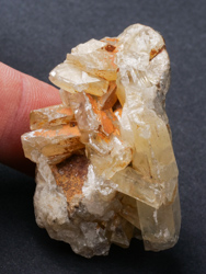Rare and highly prized is Stolzite, which sits atop a light gray, translucent quartz with sheelite crystals.Rare and highly prized is Stolzite, which sits atop a light gray, translucent quartz with sheelite crystals. It is an orange-brown color which is sharply angular in shape and earthy in luster. This piece was mined from the Ore Mountains in a tin deposit located in both Cinovec , Czech Republic and Saxony Germany.