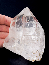 Transparent smoky quartz crystal with grey hematite and dark dravite inclusions.Transparent smoky quartz crystal with grey hematite and dark dravite inclusions. The inclusions are oriented along crystal edges. Small parts of edges and terminations are chipped.