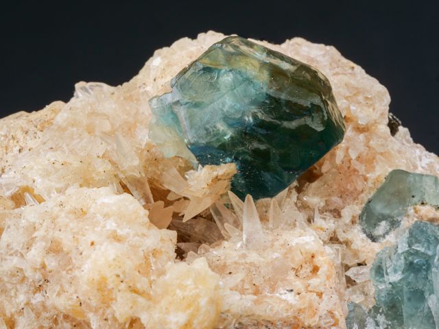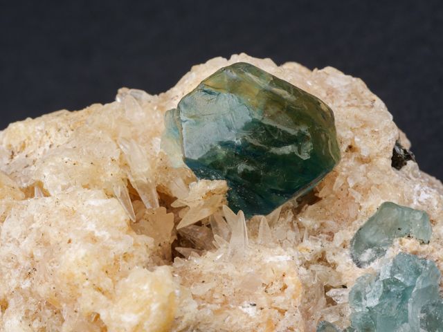 Fantastický vzorek krystalu apatitu o velikosti 1,9 cm na kalcitové podložce. Krystal je velice čistý, ukončený, lesklý a typicky oleptaný. Na drúze je i několik velmi pěkných ostrých krystalů kalcitu. V současnosti se jedná o poměrně vzácný materiál z tradiční, ale dotěžené, ruské lokality Sludjanka. Vysoce estetický vzorek.