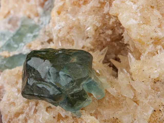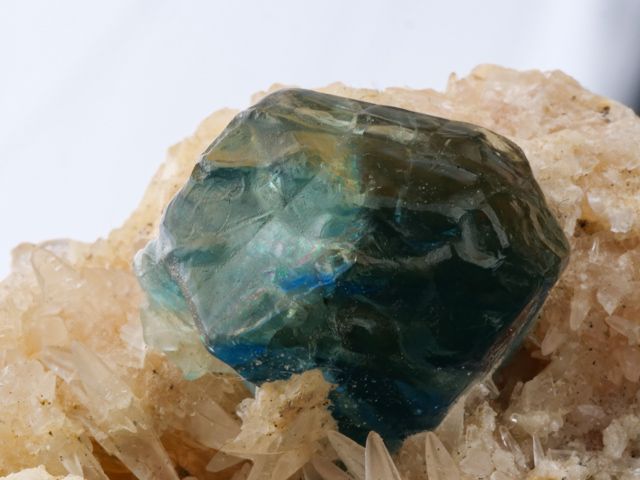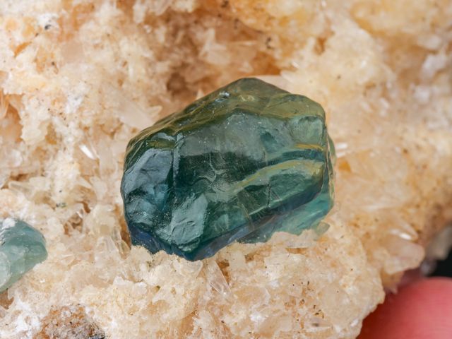 Fantastický vzorek krystalu apatitu o velikosti 1,9 cm na kalcitové podložce.
