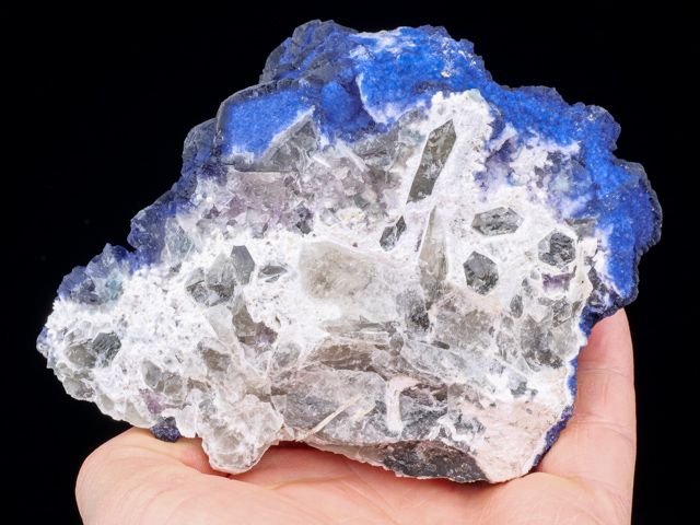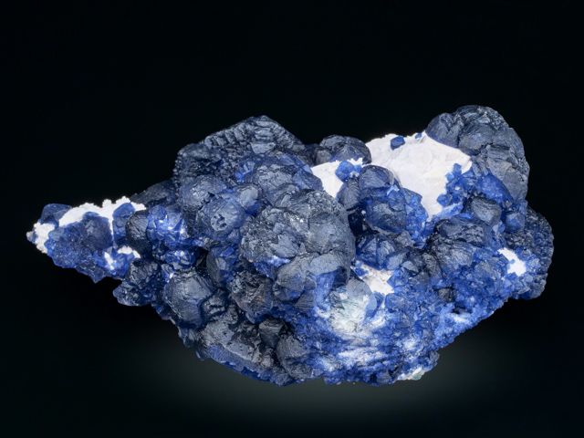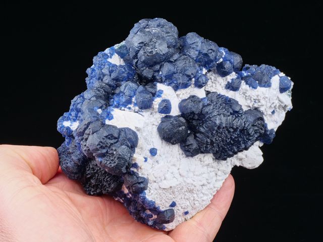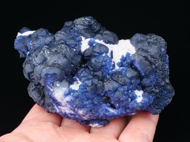 Fluorit tvoří tmavě modré, mastně až skelně lesklé, průsvitné, kubické a dipyramidální krystaly a srostlice dosahující velikosti až 31 mm, které narůstají na mléčně bílé, neprůsvitné křemeny. Vzorek není vzácně ve spodní části formátovaný podříznutím, jak tomu bývá převážně u těchto čínských vzorků.