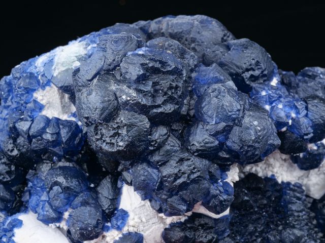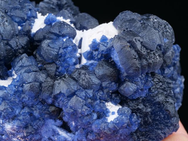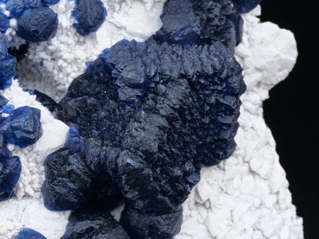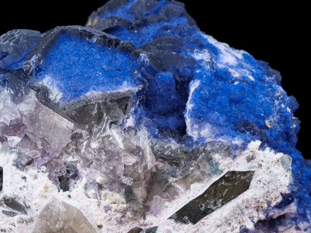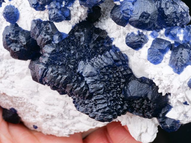 Fluorit tvoří tmavě modré, mastně až skelně lesklé, průsvitné, kubické a dipyramidální krystaly na křemenu.