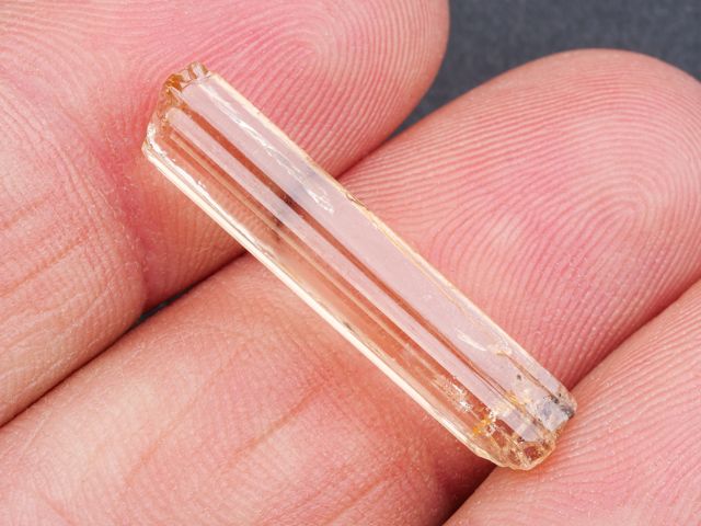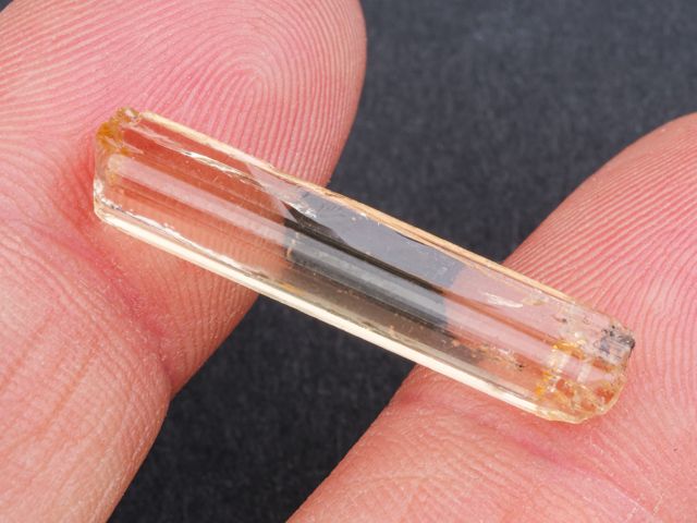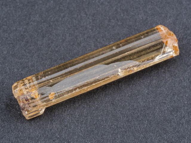 Zářivý vzorek krystalu imperial topazu. Krystal topazu měří 2,6 cm, na danou lokalitu je velmi čistý a má úžasnou medově zlatavou barvu. Zajímavý vzorek ze světově proslulé lokality Ouro Preto.