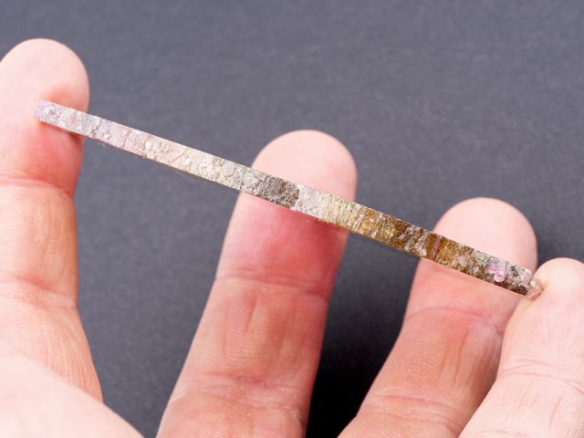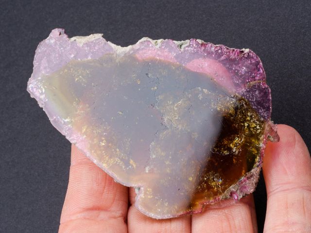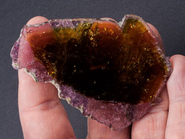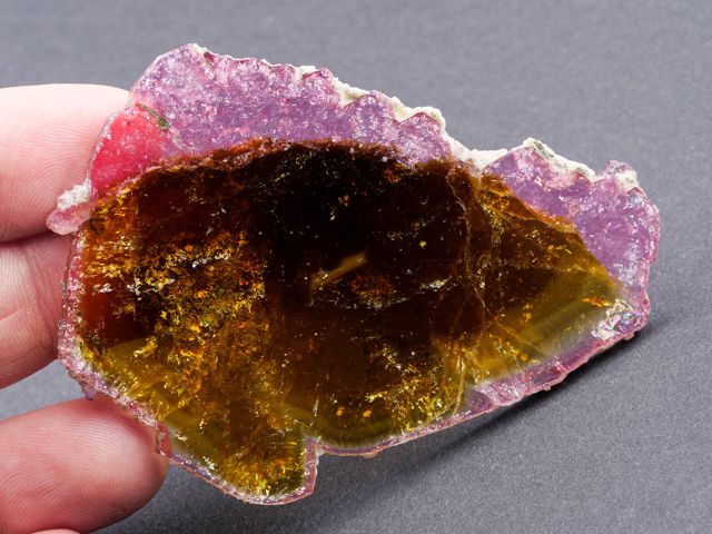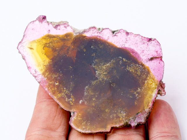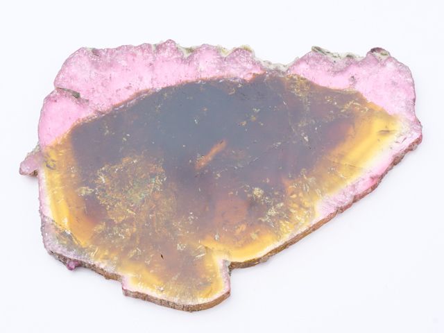 Colorful slice from a liddicoatite crystal with front and rear faces polished to highlight the bright yelow internal zone with thin pink outer zones.Colorful slice from a liddicoatite crystal with front and rear faces polished to highlight the bright yelow internal zone with thin pink outer zones. The liddicoatite slice has a cloudy internal zone and complete outer edges that show striations. No damage.