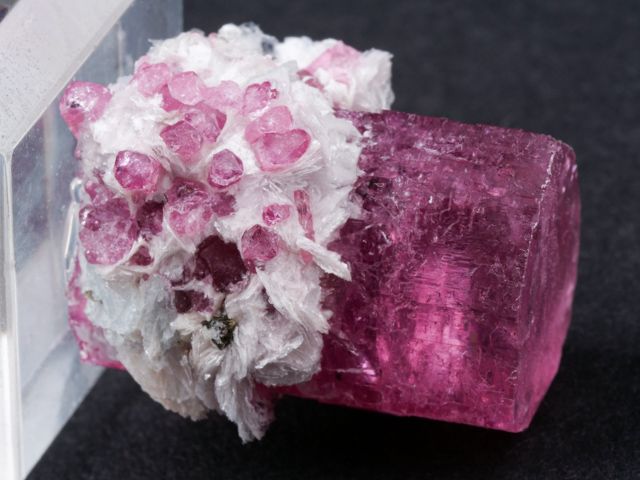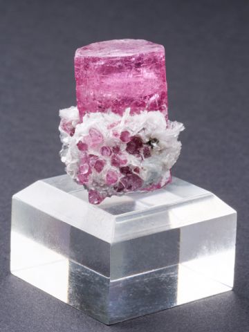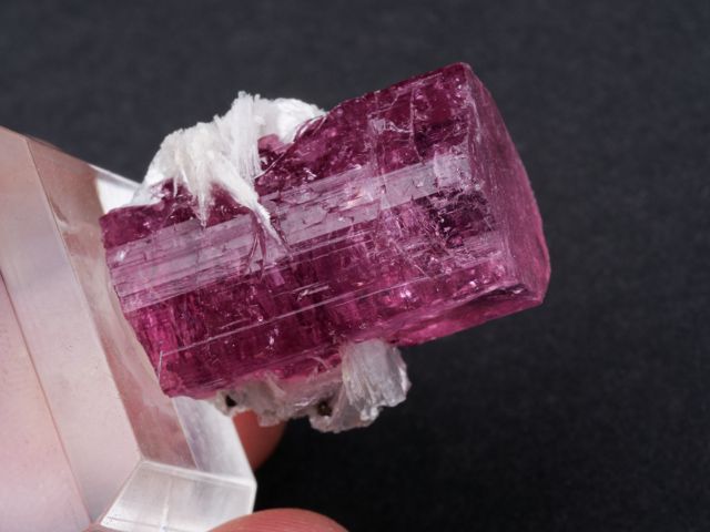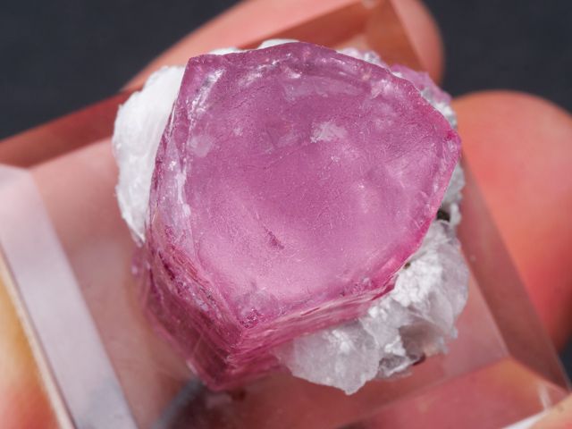 This gemmy, evenly-colored pink crystal is a non classic color and style for the locality.This gemmy, evenly-colored pink crystal is a non classic color and style for the locality. However, few truly killer thumbnails have come out compared to larger pieces, and to obtain one of this quality with some distinction or association (such as the mica associated), is quite difficult.