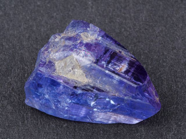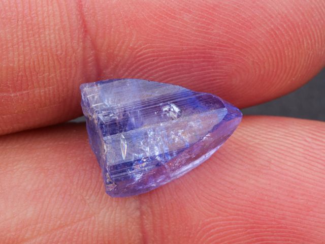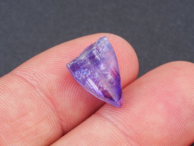 Lustrous tanzanite crystal of blue-violet tanzanite with no matrix attached. The crystal is terminated, highly lustrous, internally transparent. Small contact on the side. New find 1/2023.