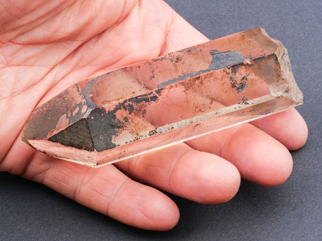 Zajímavý krystal přírodní záhnědy z ukrajinské lokality Volyň. Krystal je ukončený, lesklý a má přirozenou příjemně světle kouřovou barvu. Vysoká čistota dovoluje podobný materiál brousit - velké partie jsou drahokamové tzv. optický křemen - zde by to ale bylo velmi škoda jakkoliv s kamenem pracovat. Kámen má jen minimum velmi jemných poškození/oťuků - toto je zahrnuto do výsledné ceny. Toto jemné poškození neničí na první pohled dojem z nadstandardně efektního kamene.